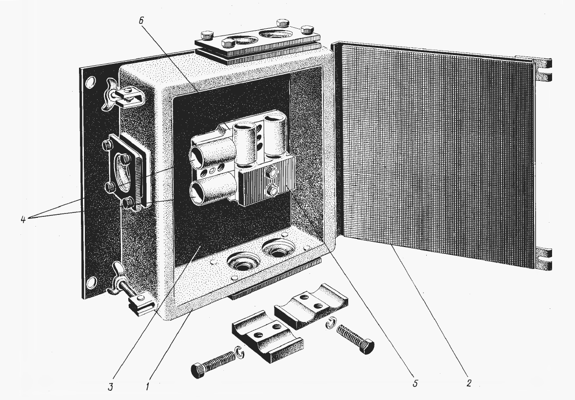 Рис.2.1 Модель СК-43БУ2 (Кат. 2ТД.671.012-01) 1 - корпус - 1шт - 5, 3 кг (5ТД.002. 164-02) 2 - крышка - 1шт - 1, 536 кг (5ТД.310.146) 3 - панель изоляционная - 1шт - 1, 1 кг (8ТД.064.846) 4 - трубка - 6шт - 062 кг (8ТД.175.188) 5 - зажим контактный - 3шт - 0, 196 кг (8ТД.574.019) 6 - зажим контактный -1 шт - 0, 9 кг (8ТД.574.020)
