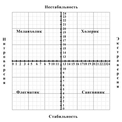 Характеризует эмоциональную устойчивость или неустойчивость (эмоциональная стабильность или нестабильность). Нейротизм, по некоторым данным, связан с показателями лабильности нервной системы. Эмоциональная устойчивость – черта, выражающая сохранение организованного поведения, ситуативной целенаправленности в обычных и стрессовых ситуациях. Характеризуется зрелостью, отличной адаптацией, отсутствием большой напряженности, беспокойства, а также склонностью к лидерству, общительности. Нейротизм выражается в чрезвычайной нервности, неустойчивости, плохой адаптации, склонности к быстрой смене настроений (лабильности), чувстве виновности и беспокойства, озабоченности, депрессивных реакциях, рассеянности внимания, неустойчивости в стрессовых ситуациях. Нейротизму соответствует эмоциональность, импульсивность; неровность в контактах с людьми, изменчивость интересов, неуверенность в себе, выраженная чувствительность, впечатлительность, склонность к раздражительности. Нейротическая личность характеризуется неадекватно сильными реакциями по отношению к вызывающим их стимулам. У лиц с высокими показателями по шкале нейротизма в неблагоприятных стрессовых ситуациях может развиться невроз. Представление результатов по шкалам экстраверсии и нейротизма осуществляется при помощи системы координат. Интерпретация полученных результатов проводится на основе психологических характеристик личности, соответствующих тому или иному квадрату координатной модели с учетом степени выраженности индивидуально-психологических свойств и степени достоверности полученных данных.