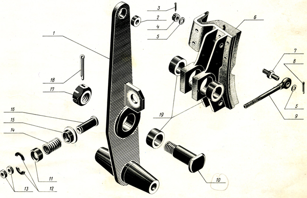 Рис. 3.2 Вид со стороны тягового электродвигателя 1 – рычаг средний (1.7170.31.41.024.00) – 9, 3 кг 2 – втулка (1.7070.31.41.203.10) – 0, 007 кг 3 - шплинт 3, 2 х 32 ГОСТ 397-79 4 - гайка М12-6Н.8.35.016 ГОСТ 5918-73 5 – шайба 12.01.016 ГОСТ 11371-78 – 2 шт. 6 – колодка (2.7030.31.41.017.20) – 6, 75 кг 7 – палец (1.7030.31.41.156.00) – 0, 064 кг 8 - шплинт 3, 2 х 20 ГОСТ 397-79 9 – стержень (1.7030.31.41.114.20) – 0, 185 кг 10 – валик средний (1.7030.31.41.121.20) – 1, 2 кг 11 – шайба (1.7030.31.41.160.10) – 0, 061 кг 12 – кольцо (1.7030.31.41.145.00) – 2 шт. 13 - гайка М12-6Н.6.35.016 ГОСТ 5915-70 – 2 шт. 14 – пружина фиксатора (1.7030.31.41.116.20) – 0, 08 кг 15 – шайба сферическая (1.7030.31.41.159.110) – 0, 068 кг 16 – втулка (1.7030.31.41.158.00) 17 - гайка М30-7Н.8.35.016 ГОСТ 5918-73 18 - шплинт 6, 3 х 60 ГОСТ 397-79 19 – втулка (1.7070.31.41.211.00) – 3 шт. – 0, 087 кг