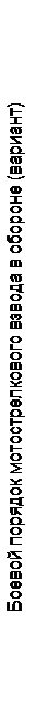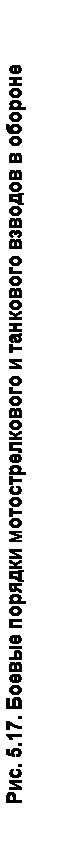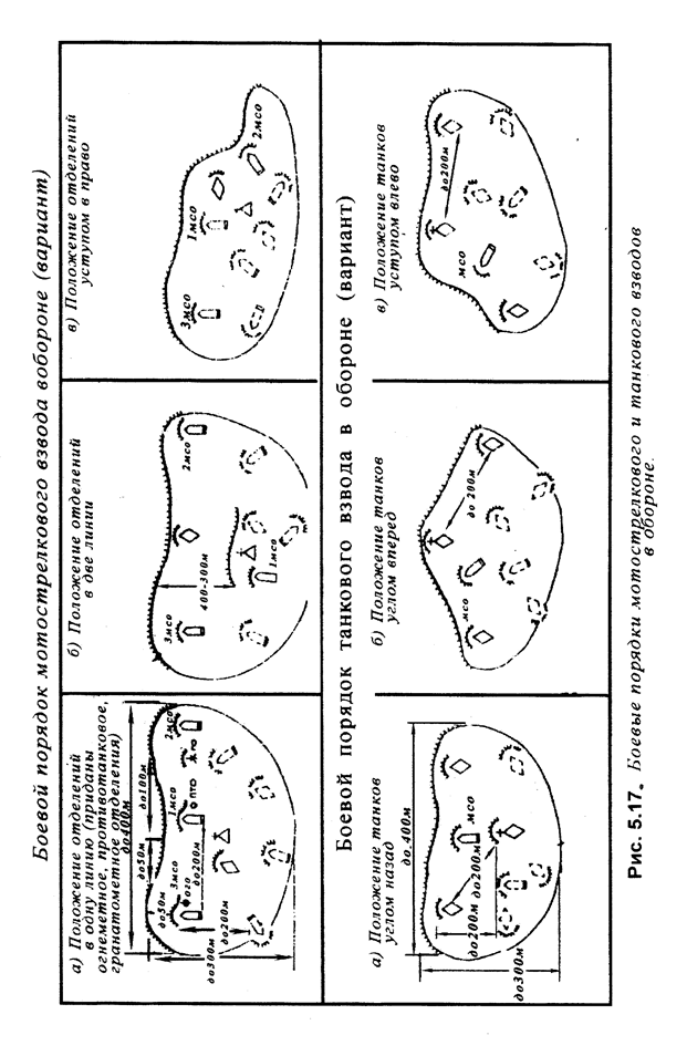 рубежа взвода – 600 м) с интервалом 900-1400м (750: 1000 м на 600 м) друг от друга, а третий рубеж – в глубину на удалении 1000 м от первых двух. При таком расположении фронт рубежа развертывания батареи составит 2, 1-2, 6 км. Мотострелковая (танковая) рота может занимать оборону в составе первого или второго эшелона батальона, либо находиться в резерве полка. Рота первого эшелона обороняет опорный пункт по фронту 1-1, 5 км и 1000-м в глубину, который оборудуется двумя или одной траншеей и состоит из опорных пунктов взводов, позиций огневых средств роты и приданных подразделения, а также заграждений и ходов сообщений (рис. 5.15). Танки, приданные мотострелковой роте, занимают оборону в ее опорном пункте. Опорный пункт танковой роты состоит из опорных пунктов танковых взводов и позиций приданных подразделений. На рис.5.16 показаны варианты построения боевых порядков танковых подразделений в обороне. Мотострелковый (танковый) взвод обороняется, как правило, в составе роты, находясь в центре боевого порядка или на ее флангах, как в первом, так и втором эшелоне. Иногда взвод может выполнять самостоятельные задачи (в охранении, огневой засаде, входить в состав бронегруппы). Мотострелковому взводу могут придаваться гранатометное отделение, противотанковое отделение, танк, а иногда инженерно–саперное отделение химики-разведчики, огнеметное отделение. Построение обороны взвода включает в себя боевой порядок взвода, его опорный пункт, систему огня. Фронт обороны взвода около 400 м, глубина опорного пункта 300 м. Боевой порядок мотострелкового взвода в обороне состоит из боевых порядков отделений и приданных огневых и других средств (рис.5.17). Взвод строит свой боевой порядок в один эшелон. Иногда одно отделение может располагаться в глубине на удалении 100-200 м от переднего края. Боевой порядок танкового взвода состоит из танков, расположенных на огневых пози