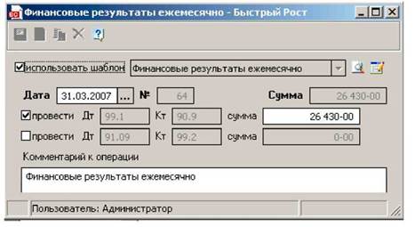 Видим, что программа на дату документа показывает суммы, накопившиеся на субсчетах 44 счета. На тех счета, на которых имеются нулевые суммы нет необходимости проводить, поэтому мы галочки ставить и не будем. Сохраняем и закрываем. Затем вводим типовую операцию «Финансовые результаты ежемесячно».