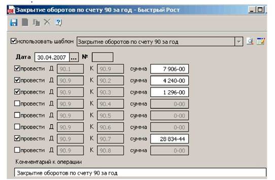 Условно считая во время нашей учебы, что 30 апреля - это конец года, введем эти типовые операции в программу. Вводим типовую операцию «Закрытие оборотов по счету 90 за год»