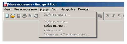 При нажатии указателем мышки на этот пункт мы попадаем в окно «Макетирование», в котором можем создать новый макет печатной формы, выбрав пункт «Добавить лист» в меню «Макет»