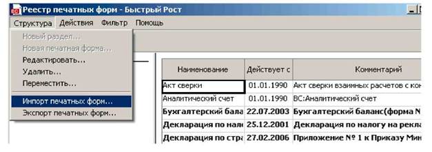 А для тех печатных форм отчетов и документов, уже ранее созданных программистами, в этих окнах есть возможность подкорректировать алгоритмы и правила заполнения ячеек при необходимости. То есть сам пользователь или программист всегда имеют возможность на рабочем месте изменить, подстроить программу под конкретные потребности, особенности своего предприятия. Далее этот макет сохраняется в виде файла по команде Файл/Сохранить как. А потом его можно загрузить в реестр печатных форм: Сервис/Реестр печатных форм. В этом окне нажать Структура/Импорт печатных форм
