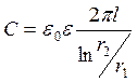 По этому выражению можно рассчитать ёмкость одножильного коаксиального кабеля (например, кабеля для телевизионной антенны или одножильных кабелей на напряжение 110…500 кВ).