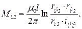 Здесь n - число витков катушки; S – площадь поперечного сечения витка; l – длина катушки. Для случая, когда магнитный поток одного контура тока пересекает другой контур, вводится понятие «взаимная индуктивность». Взаимной индуктивностью называется коэффициент пропорциональности между током первого контура и магнитным потоком, сцепленным со вторым контуром. Математически это определение записывается следующим образом: Ф2 = М12× I1. Здесь М12 – взаимная индуктивность между первым и вторым контурами; I1 – ток первого контура; Ф2 – магнитный поток, пронизывающий второй контур. Взаимная индуктивность между двумя двухпроводными линиями:
