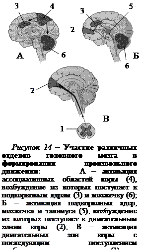 Все процессы управления движением можно представить тремя блоками: 1) блоком инициации движения, включающим лимбическую систему и ассоциативные зоны коры больших полушарий; 2) блоком программирования движения, включающим мозжечок, подкорковые узлы, моторные, или двигательные, зоны коры больших полушарий и таламус как посредник между ними, а также некоторые структуры ствола головного мозга и спинного мозга; 3) исполнительным блоком, охватывающим мотонейроны спинного мозга и иннервируемые ими мышечные волокна, т.е. нейромоторные единицы. Следует иметь в виду, что управление движением включает наряду с командами, поступающими по прямым связям к мышцам, обширную информацию, поступающую в мозг по обратным связям от рецепторов опорно-двигательного аппарата и органов чувств. Произвольные движения человека – это сознательно регулируемые движения. У человека они тесно связаны с речью. Произвольные движения, вызываемые инструкцией или внутренним побуждением человека, опосредованы внутренней речью, претворяющей замысел движения в план действий. В процессе двигательной деятельности одновременно возникает множество замкнутых циклов регулирования, например, между корой больших полушарий и мозжечком, между мотонейронами спинного мозга и мышцей, и др. Как установил русский ученый Н.А. Бернштейн, система регуляции движения является многоэтажной, или многоуровневой системой. Важную роль в этой сложной функциональной системе играет кора больших полушарий, которая управляет процессами, протекающими в этих циклах регулирования, и направляет их на решение общей задачи – достижение цели движения. Началу произвольной двигательной реакции предшествуют процессы афферентного синтеза, т.е. обработки нервных импульсов, поступающих от рецепторов и несущих информацию о состоянии организма и об окружающей обстановке, в которой нужно будет совершить двигательный акт. Вслед за этим происходит принятие решения об общей цели двигательного поведения. Наиболее распространенными примерами произвольных движений, обусловливающих перемещение тела человека из одного места пространства в другое, являются ходьба, бег и плавание. Они характеризуются стереотипным движением конечностей. В спинном мозге обнаружена цепь нейронов, отвечающая за чередование периодов возбуждения и торможения мотонейронов мышц-сгибателей и мышц-разгибателей. Эту цепь назвали спинальным генератором шагания. Она может работать в автоматическом режиме. Структуры спинного мозга находятся под непрерывным контролем отделов головного мозга. От головного мозга нервные импульсы поступают к мотонейронам спинного мозга двумя основными путями. Импульсы, поступающие по одному из этих путей, вызывают опережающую настройку мышечных рецепторов, а приходящие к мышце по другому пути приводят к ее сокращению. Значительную роль в регуляции быстрых произвольных движений выполняет мозжечок, который обеспечивает коррекцию и точность постановки конечностей на основе сравнения информации о работе спинального генератора и реальных параметров движений. Наличие значительного притока импульсов от рецепторов мышц и суставов определяет роль мозжечка в качестве блока сравнения, осуществляющего общую регуляцию двигательных функций по принципу обратной связи. Вследствие этого ком
