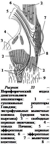 Мышечное веретено представляет собой скопление тонких поперечно-полосатых мышечных волокон, окруженных соединительнотканной капсулой. Эти волокна получили название интрафузальных, в отличие от обычных экстрафузальных мышечных волокон, обусловливающих сокращение мышцы. Мышечные веретёна расположены параллельно экстрафузальным мышечным волокнам и возбуждаются при расслаблении скелетной мышцы, т.е. дают информацию о ее растяжении и удлинении. Тельца Гольджи, или сухожильные рецепторы Гольджи, располагаются в зоне соединения мышечных волокон с сухожилием, последовательно по отношению к мышечным волокнам. Поэтому они возбуждаются при сокращении мышечных волокон вследствие натяжения сухожилия мышцы и почти не реагируют на растяжение мышечного волокна. Интенсивность импульсов от рецепторов Гольджи увеличивается пропорционально силе мышечного сокращения, что дает информацию о силе, развиваемой мышцей. Тельца Пачини представляют собой покрытые капсулами нервные окончания, которые расположены в глубоких слоях кожи, в сухожилиях и связках. Они реагируют на изменения давления, которое возникает при сокращении мышц и натяжений сухожилий, связок и кожи. Проводниковый отдел двигательного анализатора представлен нервными волокнами, идущими в составе тех же путей, что и от кожных рецепторов. Центральный отдел двигательного анализатора расположен в передней и задней центральных извилинах лобной и теменной доли коры больших полушарий и в центральной борозде, разделяющей эти доли. Интероцептивный, или висцеральный, анализатор играет важную роль в регуляции работы внутренних органов, их взаимосвязи и координации, а также в поддержании постоянства внутренней среды организма и формировании защитно-приспособительных реакций. Периферический отдел интероцептивного анализатора представлен рецепторами, расположенными во внутренних органах – интерорецепторами (интероцепторами). Интерорецепторы по своему строению и функциям делятся на механорецепторы, барорецепторы, хеморецепторы, терморецепторы, осморецепторы, болевые рецепторы и др. Возбуждение некоторых интероцепторов, например, стенок мочевого пузыря или прямой кишки, приводит к появлению четких, осознанных ощущений. Возбуждение интероцепторов сердца, сосудов, почек и ряда других органов не вызывает ясных осознанных ощущений и часто субъективно человек не может точно определить место раздражения. Изменение состояния внутренних органов, регистрируемое интероцептивным анализатором, даже если оно не осознается человеком, может оказывать значительное влияние на его настроение, самочувствие и поведение.