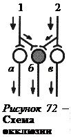 Окклюзия (рис. 72) довольно часто обнаруживается при возбуждении группы мотонейронов. При окклюзии ответ на одновременную стимуляцию нескольких нервных путей к мотонейронам меньше, чем сумма ответов, наблюдающихся при раздельной стимуляции этих путей. Причина окклюзии состоит в том, что часть эфферентных путей (на рис. 72 ответвления аксонов 1 и 2) вследствие конвергенции подходит к одним и тем же мотонейронам (б). При раздельной стимуляции входов 1 и 2 мотонейрон б будет возбуждаться дважды: сначала совместно с нейроном а и затем совместно с нейроном в. При одновременной стимуляции входов 1 и 2 нейрон б будет возбуждаться только один раз. В этом случае рефлекторный ответ будет меньше алгебраической суммы ответов при раздельной стимуляции. Таким образом, окклюзия – это явление, противоположное пространственной суммации. При увеличении интенсивности стимуляции входов к группе нейронов пространственная суммация может перейти в окклюзию.