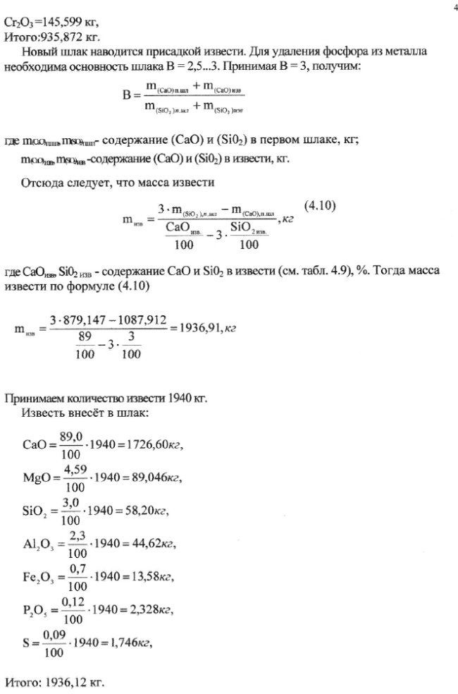 Расчет поступивших в шлак продуктов окисления металлического расплава производим на основании данных по угару элементов (табл. 4.6), входящих в табл. 4.4.Окисление элементов и ожидаемый химический состав металла по расплавлению шихты представлен в табл. 4.40. Элементы Тi, W, А1, Мо, V из-за малого их содержания в шихте в расчетах не учитываем.