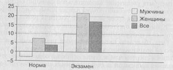 ВИК=(1-АДД/ЧСС)х100% где ВИК — вегетативный индекс Кердо; АДД — артериальное диасто-лическое давление; ЧСС — частота сердечных сокращений. Состояние экзаменационного стресса, как правило, приводит к увеличению ВИК при стрессе [5, 13, 15]. При этом следует отметить, что существуют различные количественные показатели «нормы» по этому показателю для лиц женского и мужского пола. Усредненный показатель ВИК в норме у мужчин располагается в области отрицательных величин и составляет -2, 3 ±1, 8 балла, а у женщин +7, 5 ±1, 3 балла. В условиях эмоционального стресса у мужчин (перед экзаменами) этот показатель в среднем составляет 10, 0 баллов, а у женщин 21, 4 баллов. Наглядное соотношение ВИК у мужчин и женщин, полученное в исследованиях в покое и перед экзаменом, показано на рис. 12. В последнее время особый интерес исследователей вызывает метод изучения вариабельности сердечного ритма как инструмент ис- Глава 2. Формы проявления стресса и критерии его оиенки 2.2. Оиенка уровня стресса