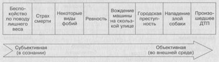 Другой способ разделения стрессоров основан на локализации проблемы: она может носить действительно объективный характер или являться плодом сознания индивидуума. Так, зеленые чертики, кото- рые мучают алкоголика во время белой горячки, представляют собой классический образец субъективной проблемы, а санитар наркологического диспансера, который отнял у данного алкоголика припрятанную бутылку водки, — это уже объективный фактор. В привычной нам реальности все стрессорные факторы можно выстроить в соответствии с ранжированной шкалой, на одном конце которой будут находиться придуманные проблемы, а другом конце -проблемы реальные, независимые от сознания человека. Чаще всего реальные проблемы существуют в коротком отрезке настоящего времени, а «виртуальные» — в прошлом или будущем (рис. 33).