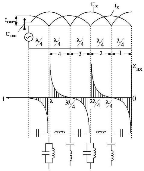 При l=λ /4 → zвх = 0. Емкостное и индуктивное сопротивления компенсируются. Активное сопротивление в линии без потерь отсутствует. Свойства отрезка длиной λ /4 сходны с последовательным колебательным контуром. При известной длине отрезка, его первая резонансная частота:
