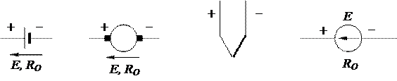 Рисунок 1.2 - Условные обозначения источников Где В элементах и аккумуляторах, внутреннее сопротивление - это сопротивление электролита и граничных слоев между электролитом и электродами, в генераторах - это сопротивление меди обмоток. Основное назначение источника энергии - создать и постоянно поддерживать в цепи разность потенциалов, разность электрических уровней; создать как бы электрический напор, под воздействием которого и образуется упорядоченное движение электрических зарядов, то есть ток. Принято зажим высшего потенциала источника обозначать знаком «+», а зажим низшего потенциала знаком «-». Разность электрических потенциалов количественно определяется величиной, которая называется - электродвижущей силой или коротко ЭДС и обозначается на схемах буквой «Е»