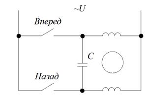 Рисунок 3.25. Принципиальная электрическая схема реверсного управления однофазного асинхронного двигателя исполнения Е.