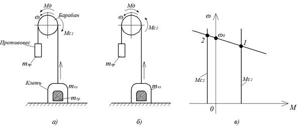Рисунок 4.1 Технологическая схема шахтной подъемной установки при подъемной клети с грузом (а), при подъеме пустой клети (б) и механические характеристики при этих случаев (в).