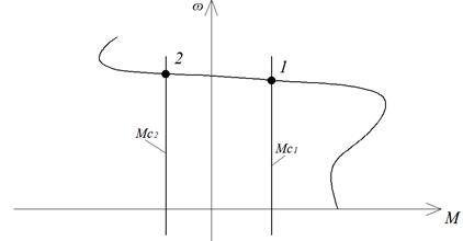 Двигатели постоянного тока последовательного возбуждения не имеет генераторного торможения, поскольку его механическая характеристика не пересекается с осью скорости. Асинхронный двигатель, в приводе подъемной установки работает аналогичным образом, переходя от точки 1 (двигательный режим) к точке 2 (генераторный режим), рисунок 4.2.