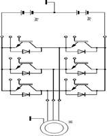 Импульсное регулирование скорости производится путем периодического включения двигателя в сеть и отключения его от сети или путем периодического шунтирования с помощью контактора К сопротивлений, включенных последовательно в цепь статора, или полупроводниковых вентилей. При этом двигатель беспрерывно находится в переходном режиме ускорения или замедления скорости вращения ротора и в зависимости от частоты и продолжительности импульсов работает с некоторой, приблизительно постоянной скоростью вращения. Подобное регулирование скорости применяется только для двигателей весьма малой мощности ________________________________ 70 Приведите одну из схем, реализующую импульсное управление АД и его механическую характеристику.Имеется общая схема силовой части импульсного управления 3-х фазным асинхронным двигателем в электромобиле.