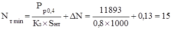Правильное определение числа и мощности цеховых трансформаторов возможно только путем технико-экономических расчетов с учетом следующих факторов: категории надежности электроснабжения потребителей; компенсации реактивных нагрузок на напряжении до 1кВ; перегрузочной способности трансформаторов в нормальном и аварийном режимах; шага стандартных мощностей; экономичных режимов работы трансформаторов в зависимости от графика нагрузки. Данные для расчета: Рp0, 4= 11893 кВт; Qp0, 4= 10097 квар; Sp0, 4= 15601 кВА. Трансформаторно-строительный завод относится ко 2 категории потребителей, завод работает в две смены, следовательно, коэффициент загрузки трансформаторов Кзтр=0, 8. Принимаем трансформаторы мощностью Sнт=1000кВА. Для каждой технологически концентрированной группы цеховых трансформаторов одинаковой мощности минимальное их число, необходимое для питания наибольшей расчетной активной нагрузки, рассчитывается по формуле: