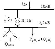 Рисунок 1. Из условия баланса реактивной мощности на шинах 0, 4 кВ определим величину Qнбк 1: Qнбк 1+Q1=Qр 0, 4, отсюда Qнбк 1= Qр 0, 4 - Q1=10097-4731, 67=5365, 13 квар Дополнительная мощность Qнбк2 НБК для данной группы трансформаторов принимаю Qнбк2=0, отсюда следует, что Qнбк=Qнбк 1+Qнбк 2 = 5365, 13+0=5365, 13 квар. Определим мощность одной батареи конденсаторов, приходящуюся на каждый трансформатор: