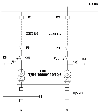 Рисунок 4. Первый вариант схемы электроснабжения. Выбираем электрооборудование по I варианту. 1) Выбираем трансформаторы ГПП: