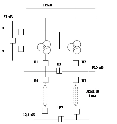 Затраты на выключатели В1 и В2: КВ1, В2=2× γ × Кв=2× 0, 31× 5, 54× 1000 =3, 46 тыс у.е. Затраты на выключатель В3: КВ3=γ × Кв=0, 31× 5, 54× 1000 =1, 73 тыс у.е. Затраты на выключатели В4, В5: КВ4, В5=2× Кв=2× 5, 54× 1000 =11, 08 тыс у.е. Затраты на ЛЭП Куд.=13, 95 тыс. у.е./км КЛЭП=l× Куд=5× 13, 95× 1000 = 69, 75 тыс у.е. Затраты на Ввод: Кввод=2× Кр, од, кз=2× 2, 92× 1000 =5, 84 тыс у.е. Затраты на трансформаторы подстанции энергосистемы: Кат=2× γ × К тр =2× 0, 157× 94, 4× 1000 =29, 61 тыс у.е. Затраты на трансформаторы ГПП: Кт гпп=2× 28, 3× 1000 =56, 6 тыс у.е.