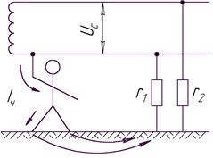 Все токоведущие части любой сети, находящиеся под напряжением, нормально должны быть изолированы от земли. Сопротивление провода по отношению к земле, называется сопротивлением изоляции или сопротивление утечки, складывающиеся из сопротивления изоляции самого провода и последовательно включенных участков пути на землю (строительные конструкции, пол, почва). По этой цепочке сопротивлении под действием разности потенциалов между проводом и землей протекает небольшой ток; который называется током утечки (r1 и r2 - сопротивление изоляции или сопротивление утечки). В случае прикосновения человека к фазе сети его сопротивление сопротивлением утечки этой фазы. Ток, протекающий через человека будет равен: