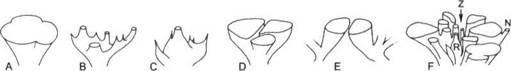 Рисунок 15 – Происхождение типов ареалов растений (распространение — по горизонтали, время — по вертикали снизу вверх, современное состояние — на срезе ровной поверхности, вымершие популяции — ниже уровня этой поверхности): А — расширение ареала (например, Trifolium reports, ал.). Отмирание популяций и сокращение до дизъюнктивного ареала В (например, Pinus nigra,) или до реликтового палеоэндемичного С (например, Gingko biloba); D — аллопатрическая дифференциация близкородственной группы на три викарирующих таксона (например, Erysimum sect. Cheiranthus, продукты аллопатрического образования родственных видов, так называемых схизоэндемиков различных участков Эгейской области); Е — псевдовикарирование двух не близкородственных, но экологически и, соответственно, географически замещающих друг друга видов (например, Gentiana clusii и G. acaulis s. str.); F — круг форм с единым центром многообразия (Z — центр формирования, R — реликтовые эндемики, N — неоэндемики) (например, Carlina). Схема поясняет, что между возрастом таксона, разнообразием его форм и размером его ареала отсутствует непосредственная связь