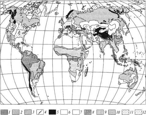 Рисунок 19 – Основные биомы Земли: 1 — дождевыетропические леса: 2 —листопадные тропические леса и саванны: 3— колючее редколесье и колючекустарниковые саванны; 4 — мангрова; 5 — высокогорные формации; 6 — полупустыни и пустыни; 7 — степи; 8 — склерофильные леса; 9— леса теплого умеренною пояса; 10 — бореальные хвойные леса; 11 — тундры; 12— территории с практически полностью антропогенно - измененной растительностью