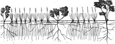 Саванны приурочены к экваториальной и тропической климатическим зонам. В зависимости от особенностей увлажнения саванны сильно различаются флористически и в меньшей мере — обликом. Общую черту саванн составляют отдельно стоящие деревья, часто с зонтиковидной кроной, и мощно развитый травяной покров, в котором безраздельно доминируют высокие злаки (рисунок 22); в некоторых саваннах многочисленны колючие кустарники. Влажные саванны развиваются в зоне дождевых тропических лесов, главным образом в регулярно затопляемых местах. Поэтому их обычно называют затопляемыми саваннами, хотя они есть и на незатопляемых территориях. Значительно шире распространены влажные саванны в зоне муссонного климата. Для влажных саванн характерны высокие (до 5 м) широколистые злаки, а деревья представлены видами тех же родов, что свойственны и муссоновым и саванновым лесам. Исключение составляют лишь влажные саванны Кубы, в которых древесный компонент представлен тропическими соснами (Pinus) и дубами (Quercus). Влажные саванны могут быть естественным типом растительности (возможно, одной из стадий сукцессионной системы), но большая их часть, несомненно, возникла вследствие деятельности человека, систематически раскорчевывавшего и выжигавшего леса для хозяйственных нужд. Сухие саванны располагаются среди сухих листопадных тропических лесов, причем разграничить те и другие не всегда легко из-за того, что все различия сводятся по существу к большей, чем в лесу, разреженности древостоя при практически одинаковом флористическом составе этих растительных сообществ. Доминирующие злаки сухой саванны относительно низкорослы (0, 5 — 1, 5 м) и более узколистны, чем злаки влажной саванны. Еще труднее разграничить сухие колючие редколесья и самые сухие саванны — колючекустарниковые, которым свойственна достаточно богатая флора колючих склерофитов и суккулентов, формирующих густые заросли высотой 1, 5-4 м.