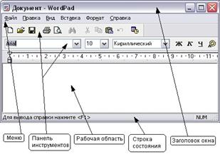 Зовнішній вигляд вікон може бути самим різним, але є декілька елементів, які присутні в більшості вікон. Як приклад типового вікна розглянемо вікно програми WordPad, призначеної для створення і редагування текстових документів. Для запуску програми слід вибрати команду головного меню Всі програми * Стандартні * WordPad (Рисунок. 1.8).