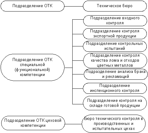 Система контроля качества продукции представляет собой совокупность взаимосвязанных объектов и субъектов контроля, используемых видов, методов и средств оценки качества изделий и профилактики брака на различных этапах жизненного цикла продукции и уровнях управления качеством. Эффективная система контроля позволяет в большинстве случаев осуществлять своевременное и целенаправленное воздействие на уровень качества выпускаемой продукции, предупреждать всевозможные недостатки и сбои в работе, обеспечивать их оперативное выявление и ликвидацию с наименьшими затратами ресурсов. Положительные результаты действенного контроля качества можно выделить и в большинстве случаев определить количественно на стадиях разработки, производства, обращения, эксплуатации (потребления) и восстановления (ремонта) продукции. В рыночных условиях хозяйствования существенно возрастает роль служб контроля качества продукции предприятий в обеспечении профилактики брака в производстве, усиливается их ответственность за достоверность и объективность результатов осуществляемых проверок, недопущение поставки потребителям продукции низкого качества. Необходимость первоочередного совершенствования деятельности служб технического контроля предприятий определяется их особым местом в производственном процессе. Так, непосредственная близость к контролируемым объектам, процессам и явлениям (во времени и пространстве) создает работникам контрольных служб наиболее благоприятные условия для следующего: разработки оптимальных планов контроля, основанных на результатах длительного наблюдения, анализа и обобщения информации о качестве исходных компонентов готовой продукции, точности оборудования, качестве инструмента и оснастки, стабильности технологических процессов, качестве труда исполнителей и других факторах, оказывающих непосредственное влияние на качество продукции; предупреждения брака и обеспечения активного профилактического воздействия контроля на процессы возникновения отклонений от требований утвержденных стандартов, технических условий, параметров действующих технологических процессов и др.; своевременного проведения в необходимом объеме всех предусмотренных контрольных операций; целенаправленного оперативного изменения условий функционирования объекта контроля для устранения возникающих сбоев в работе и предотвращения производства и поставки потребителям изделий ненадлежащего качества. Необходимо подчеркнуть, что контроль качества, осуществляемый соответствующими подразделениями предприятий, является первичным (предшествующим во времени) по отношению к контролю со стороны других субъектов управления качеством. Это обстоятельство свидетельствует о необходимости первоочередного совершенствования деятельности служб технического контроля на предприятиях. На рис.4.6 показан типовой состав структурных подразделений отдела технического контроля (ОТК) крупного предприятия. Операции контроля качества – неотъемлемая составная часть технологического процесса производства изделий, а также их последующей упаковки, транспортировки, хранения и отгрузки потребителям. Без проведения работниками контрольной службы предприятия (цеха, участка) необходимых проверочных операций в процессе произ