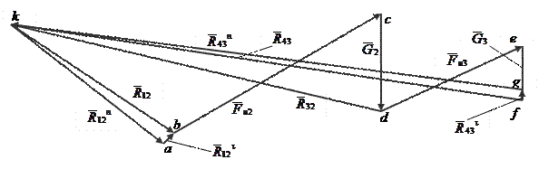 В число сил и моментов, входящих в эти уравнения, включаются реакции и моменты реакций в кинематических парах группы. На основании уравнений строится многоугольник сил, который носит название плана сил, причём в первую очередь находятся реакции во внешних кинематических парах группы, а затем во внутренних парах по условиям равновесия звеньев группы, взятых порознь. Составляем уравнение равновесия группы, состоящей из звеньев 2 и 3
