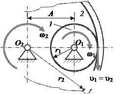 Передаточное отношение равно обратному отношению радиусов тел качения. Расстояние между осями вращающихся валов называют межцентровым расстоянием A. Из рис. 1 и формулы (3) следует: A = O 1 O 2 = r 1 + r 2 = r 1 + u × r 1 = r 1 (1 + u); (4)