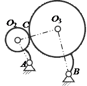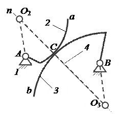 Тақ ырып: Жазық механизм жоғ ары жұ птарын тө менгі жұ птармен ауыстыру. Жазық механизм қ ұ рамында тө менгі жә не жоғ ары жұ п қ ұ ратын буындары мү мкін болатындығ ы белгілі. Механизм қ ұ рылымын жә не кинематикасын оқ ып ү йренгенде кө п жағ дайларда кинематикалық тізбектердің немесе буындардың жоғ ары жұ птарын, тек тө менгі айналмалы жә не ілгерілемелі V класс жұ тар арқ ылы ауыстырғ ан қ олайлы болады. 1 – суретте кө рсетілген ү ш буынды механизмді қ арастырамыз. Механизмді тірек 1 – мен V класса A жә не B айналмалы жұ п қ ұ рамында қ озғ алмалы 2 жә не 3 буындары жә не элементтері a жә не b шең бер радиусы O 2 C и O 3 C болатын жоғ ары IV класс жұ п C қ ұ рады. (5) – формуланы пайдаланып еркіндік дә режесін есептейміз: W = 3 n – 2 p 5 – p 4 = 3× 2 – 2× 2 – 1 = 1.