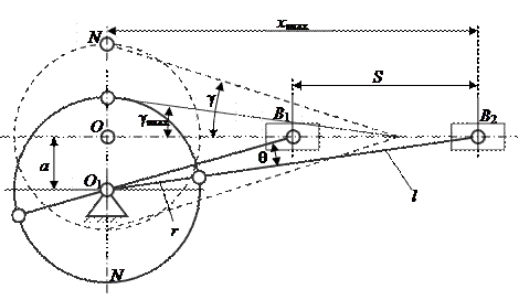 Кривошип – жылжымалы механизмді жылжыма S орнын ауыстыруына байланысты синтездеу. Бұ л орын ауыстыруды ә р тү рлі бұ лғ ақ ө лшемдері бойынша орындауғ а болады. Сондық тан, жылжыманың ең шекті орнынан кривошипке дейінгі x max максимал қ ашық тық қ осымша беріледі. Бұ л ө лшем жобасын қ ұ ратын механизмнің габаритін анық тайды. Аксиалды механизм ү шін (2 – сурет): OB 2 = x max = l + r; B 1 B 2 = S = 2 r, осыдан Кривошип – жылжымалы механизмді жобалау