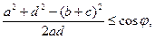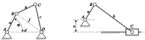 Буындарының ұ зындық тары a, b, c и d ә ріптерімен белгіленген топсалы тө рт буынды механизм берілген дейік. Егер a < b < c < d болады деп тұ жырымдасақ, онда қ андай жағ дайда AB буыны кривошип болатынын, яғ ни 2p бұ рышына бұ рыла алатынын анық тау керек. B жә не D нү ктелерін тү зуімен қ осамыз жә не BD аралығ ын ә ріп f арқ ылы белгілейміз. Онда ү шбұ рыш ABD – дан: f 2 = a 2 + d 2 - 2 a× d × cos j, (6) ал ү шбұ рыш BCD – дан: b + c ³ f ³ c - b. (7)