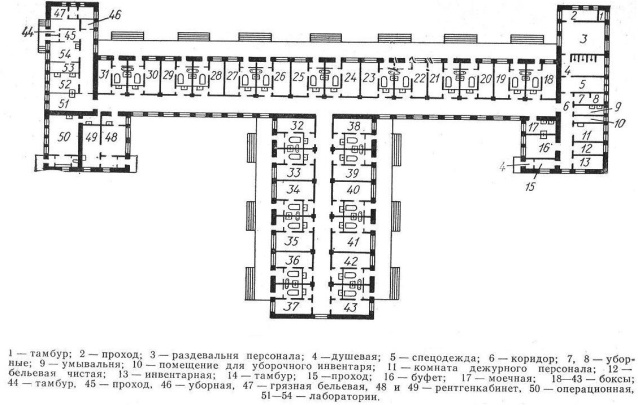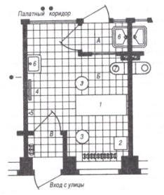1. Оқ шаулау бө лмесі 2. Оперблок 3. Қ абылдау-қ арау блогы 4. Боксталғ ан палата 5. Стерилизациялық бө лімшесі