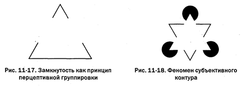 Рис. 11-16. Хорошее продолжение как принцип перцептивной группировки Если контур фигуры имеет разрывы, то мы склонны как бы заполнять их, дополнять фигуру до некоторго целостного образа. Этот принцип получил название замкнутости. Например, на рис. 11-17 мы видим треугольник, несмотря на разрывы в его контуре. Интересно, что мы можем видеть контур там, где в действительности его нет. Посмотрите на рис. 11-18. Вы ясно видите белый треугольник, обращенный вершиной вверх. Причем этот белый треугольник воспринимается как более белый, чем фон. На самом деле треугольника как такового нет, кроме того, мнимый треугольник ничуть не белее фона. Этот феномен получил название «эффект субъективного контура» (Kanizsa G., 1976). По мнению многих исследователей восприятия, в основе феномена субъективного контура лежат принципы замкнутости и хорошего продолжения. На начальном этапе развития гештальтпсихологии ее представители (Koehler W., 1947) настаивали на том, перцептивная организация — это просто функция стимула, результат процессов, идущих снизу вверх. Однако дальнейшие исследования показали, что такие факторы, как опыт субъекта, его установки, оказывают существенное влияние на процессы организации стимульной информации.