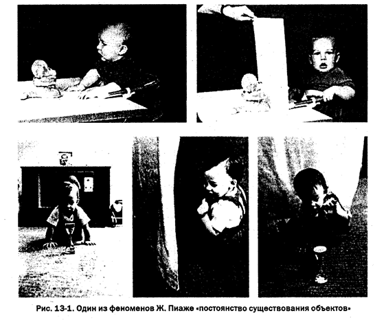 Мышление часто ассоциируется у нас с бородатым мудрецом, размышляющим над устройством мироздания. Конечно, теоретическое, научное или философское мышление представляют собой высокоразвитую форму этого процесса. Однако у животных и у детей мы наблюдаем такие формы деятельности, которые вполне подходят под данное выше определение мышления. Возьмем следующий пример из классического опыта В. Келера, проведенного над шимпанзе. «Шесть молодых животных... запираются в помещении с гладкими стенами, потолок которого (примерно 2 м высотой) они не могут достать; деревянный ящик (50 х 40 х 30 см) стоит почти на середине помещения плашмя, причем открытая его сторона направлена кверху; цель прибита к крыше в углу (в 2, 5 м от ящика, если мерить по полу). Все животные безуспешно стараются достать цель прыжком с пола; Султан, однако, скоро оставляет это, беспокойно обходит помещение, внезапно останавливается перед ящиком, хватает его, перевертывает его с ребра на ребро прямо к цели, взбирается на него, когда он находится еще примерно на расстоянии 0, 5 м (горизонтально), и, сейчас же прыгнув изо всех сил, срывает цель» (Келер, 1981, с. 241-242). В этом примере мы видим высокоорганизованное поведение шимпанзе, которое может быть названо интеллектуальным. Шимпанзе использует здесь орудие, для чего требуется установить ненаблюдаемые отношения объектов, то есть, по данному выше определению, совершить акт мышления. Но мышление протекает здесь не в речевом плане, а в плане реальных действий с внешними предметами. Для обозначения этого явления Келер использовал словосочетание «ручной интеллект». В отечественной психологии прижился термин «наглядно-действенное мышление». Практически синонимично первым двум и выражение, которое использовал Ж. Пиаже, — «сенсо-моторный интеллект». Мы кратко рассмотрим лишь одну систему понятий, используемую для описания сенсомоторного интеллекта. Эта система понятий предложена Ж. Пиаже, и центральным в ней является понятие «схема». Это понятие вводится как противоположность рефлексу как жестко установленной связи между стимулом и реакцией (ударили под коленом — нога вздрогнула). Схема представляет собой инвариант организации семейства родственных действий. Например, действие хватания, направляемое схемой, не является жестко заданным, оно зависит от того, на какой объект оно направлено: при схватывании погремушки движения пальцев ребенка не такие, как при хватании, скажем, одеяла. В терминах Пиаже схема действия ассимилирует различные предметы. Ассимиляция новых, неизвестных объектов предполагает изменение схемы, ее аккомодацию. Эти не слишком сложные понятия оказываются чрезвычайно полезными при описании пути развития, который проходит сенсомоторный интеллект. Исходно описание сенсомоторного интеллекта было разработано Пиаже на материале развития собственных детей в младенческом возрасте (рис. 13-1). Однако этот способ описания применим и к интеллекту животных. В частности, А. Ре провел таким образом исследования развития цыплят. Основным результатом А. Ре было то, что цыплята проходят примерно те же этапы развития, что и человеческие младенцы, причем на первых порах более быстро, только это развитие останавливается намного раньше. Согласно Пиаже, в развитии сенсомоторного интеллекта можно выделить шесть основных эта