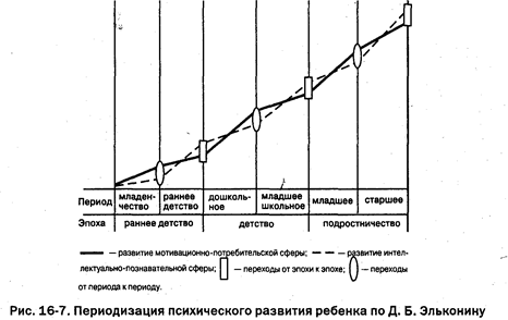 Взрослый выступает перед ребенком не столько как человек, сколько как представитель определенного общества, имеющий социальные роли, установки, мотивы, стереотипы действий, в том числе и стереотипы воспитания. Следовательно, взрослый — это «общественный» взрослый. Деятельность ребенка внутри систем «ребенок - общественный предмет» и «ребенок - общественный взрослый» представляет единый процесс, в котором формируется сама личность ребенка. Однако, составляя единый процесс освоения систем «ребенок-вещь» и «ребенок-взрослый» в рамках ведущей деятельности данного возраста, одна из систем выступает на первый план, занимая доминирующее положение. Следовательно, сменяющие друг друга ведущие деятельности определяют последовательное чередование систем «ребенок-вещь» и «ребенок-взрослый». В табл. 16.1 представлены возрастные периоды смены ведущей деятельности.