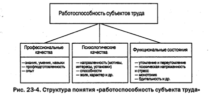 Успешность выполнения трудовых задач и удовлетворенность этим процессом во многом зависит от уровня работоспособности субъекта труда, которая формируется в результате выполнения человеком конкретной деятельности, проявляется и оценивается в ходе ее реализации. Работоспособность — это социально-биологическое свойство человека, отражающее его возможность выполнять конкретную работу в течение заданного времени с необходимым уровнем эффективности и качества. Работоспособность определяется комплектом профессиональных, психологических и физиологических качеств субъекта труда (рис. 23-4). Уровень, степень устойчивости, динамика работоспособности зависит от инженерно-психологических, гигиенических и других характеристик, средств (орудий), содержания, условий и организации конкретной деятельности, а также от системы психолого-физиологического прогнозирования и формирования профессиональной пригодности, то есть системы отбора и подготовки специалистов. Уровень работоспособности отражает, во-первых, потенциальные возможности субъекта выполнять конкретную работу, его личные профессионально ориентированные ресурсы и функциональные резервы и, во-вторых, мобилизационные возможности личности активизировать эти ресурсы и резервы в необходимый рабочий период. Степень устойчивости работоспособности обусловливается сопротивляемостью организма и личности к воздействию неблагоприятных факторов деятельности, а также запасом прочности, натренированностью, развитием профессионально значимых качеств субъекта труда.