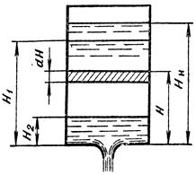 Задача об истечении жидкости при переменном напоре обычно сводится к определению времени опорожнения или наполнения всего сосуда в зависимости от начального наполнения, формы и размеров сосуда и отверстия. Такие задачи решают при наполнении и опорожнении резервуаров, цистерн, водохранилищ, бассейнов, шлюзовых камер. Необходимо иметь в виду, что в этих случаях вследствие непрерывного изменения напора, а следовательно, и непрерывного изменения скоростей и давлений всегда наблюдается неустановившееся движение жидкости, поэтому при расчетах нельзя использовать обычное уравнение Бернулли. При решении таких задач полное время истечения жидкости разделяют на бесконечно малые промежутки, в течение каждого напор считают постоянным, а движение жидкости установившимся. Рассмотрим простейший пример истечения жидкости в атмосферу через донное отверстие площадью s из открытого вертикального цилиндрического сосуда, одинакового по всей высоте поперечного сечения S (рис. 8.4, а).