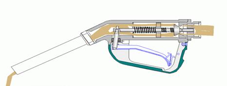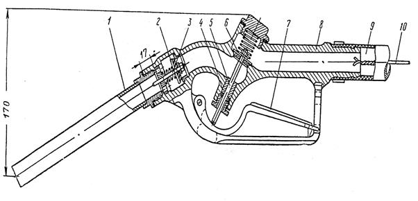 12.5.2. Определение основных размеров раздаточного крана Раздаточный кран (рис. 12.16), являющийся замыкающим звеном бензоколонки, должен быть удобным в обращении, легким, без подтекания топлива, взрывобезопасным, красивым в оформлении и соответствующим всем требованиям эргономики. Раздаточные краны имеют различные конструктивные решения, но выполняют одну функцию: наполнение бака топливом. Время заправки зависит от емкости бака и расхода жидкости через кран. Время, затрачиваемое на заправку одного автомобиля, принимается для бензина равным 3 мин, для дизельного топлива – 5 мин.