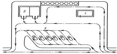 Рис. 12.30. Планировочная схема АЗС со встроенным пунктом технического обслуживания автомобилей: 1 – мойка; 2 – пункт техобслуживания; 3 – операторная и торговый зал; Пункты технического обслуживания автомобилей на АЗС должны иметь оборудование для наружной мойки и смазки автомобилей, приборы для регулировки ходовой части, а также средства диагностики технического состояния автомобилей. Для нормальной работы и отдыха работников АЗС планировка здания должна соответствовать строительным нормам и правилам (СНиП). Технические характеристики зданий АЗС приведены в таблице 12.8.