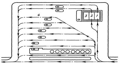 Рис. 12.27. Планировочная схема АЗС на 1000 заправок в сутки: 1 – бензин Аи-92; 2 – бензин Аи-95; 3 – дизельное топливо; 4 – бензин Аи-98