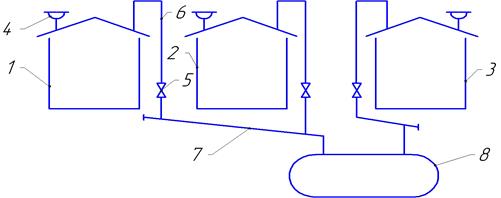 Рис. 14.3. Схема газовой обвязки со сборником конденсата: 1, 2, 3 – резервуары с одинаковыми нефтепродуктами; 4 – дыхательный клапан; 5 – задвижка; 6 – отвод; 7 – коллектор; 8 – конденсатосборник Газоуравнительная система отличается от газовой обвязки наличием конденсатосборника и газгольдера (рис. 14.4). Они служат для того, чтобы аккумулировать часть паровоздушной смеси при несовпадении операций закачки – выкачки. Благодаря этому сокращаются потери нефтепродуктов по сравнению с газовой обвязкой, изображенной на рис. 14.3. Газгольдер 3 (англ. держатель газа) – стационарное стальное сооружение для приёма и хранения газовых фракций нефтепродукта.
