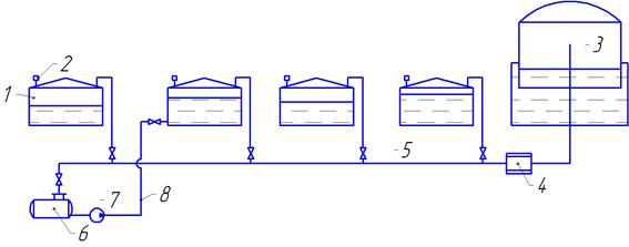 Рис. 14.2. Схема газововой обвязкирезервуаров АЗС: 1 – резервуары; 2 – предохранители угловые; 3 – клапан дыхательный Газовую обвязку целесообразнее выполнять с применением конденсатосборника (рис. 14.3). В этом случае необходимо, чтобы операция заполнения одних резервуаров совпадала по времени с опорожнением других. Паровоздушная смесь из заполняемых резервуаров не вытесняется в атмосферу, а поступает в опорожняемые резервуары [18]. Часть паровоздушной смеси конденсируется в сборнике 8.