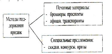 Рис. 26 Классификация средств рекламы Это: каталоги, реклама в СМИ, уличная реклама, реклама в местах продажи, брошюры, проспекты и т.д. Реклама выполняет целый ряд функций: - информирование об ассортименте, цене, качество туристического продукта; - побуждение к приобретению методом убеждения в преимуществах рекламируемого продукта; - формирование доверия клиента к товару, к туристической организации. К методам поддержки продаж (рис. 27) можно отнести использование печатных материалов (брошюр, проспектов, писем-продаж, афиш) и специальных предложений (скидки, конкурсы, лотереи, призы и сувениры).