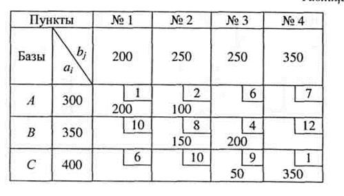 Если задача является открытой, то необходимо провести процедуру закрытия задачи. С этой целью при a < b добавляем фиктивного поставщика A'm+1 с запасом груза a' m+1 = b – a. Если же a > b, то добавляем фиктивного потребителя B' n+1 с заказом груза b'n+1 = a – b. В обоих случаях соответствующие фиктивным объектам тарифы перевозок c'ij полагаем равными нулю. В результате суммарная стоимость перевозок z не изменяется. Решение ТЗ разбивается на два этапа: 1. Определение начального допустимого базисного решения (первоначального опорного плана) – первоначального распределения поставок. 2. Посроение последовательных итераций, улучшающих опорный план (каждый новый план не должен увеличивать сумарные затраты). Существует несколько способов нахождения опорного плана (исходного решения). 1) Метод «северо-западного» угла (диагональный метод) заключается в заполнении клеток таблицы таким образом, чтобы последовательно закрывались столбцы таблицы. Заполнение таблицы начнем с клетки (1, 1). Так как х11 = min{300, 200} = 200, то первый столбец закрыт, при этом остаток на базе А составляет 100 единиц. Рассмотрим заполнение второго столбца таблицы. Так как потребности пункта № 2 составляют 250 единиц, то они могут быть удовлетворены поставкой из базы А 100 единиц и из базы В 150 единиц. Таким образом, x12=min{300-200, 250} = 100, a х22 = min{250-x12, 250} = min{150, 250} = 150. Заполнение второго столбца закончено. Переходим к заполнению третьего столбца. Потребности пункта № 3 составляют 250 единиц, наличие на базе В составляет 350 - х22 = 200 единиц, поэтому удовлетворение потребности пункта № 3 возможно поставками с базы В 200 единиц и с базы С 50 единиц, т. е. х23=200, а х33 = min{250-x23, 250] = 50, остаток на базе С 400 - х33 = 400 - 50 = 350 единиц. Заполнение третьего столбца закончено. Переходим к заполнению четвертого столбца. Так как потребности пункта № 4 — 350 единиц, то они полностью удовлетворяются поставкой с базы С, поэтому х34 = 350 (табл. 1). Таблица 1